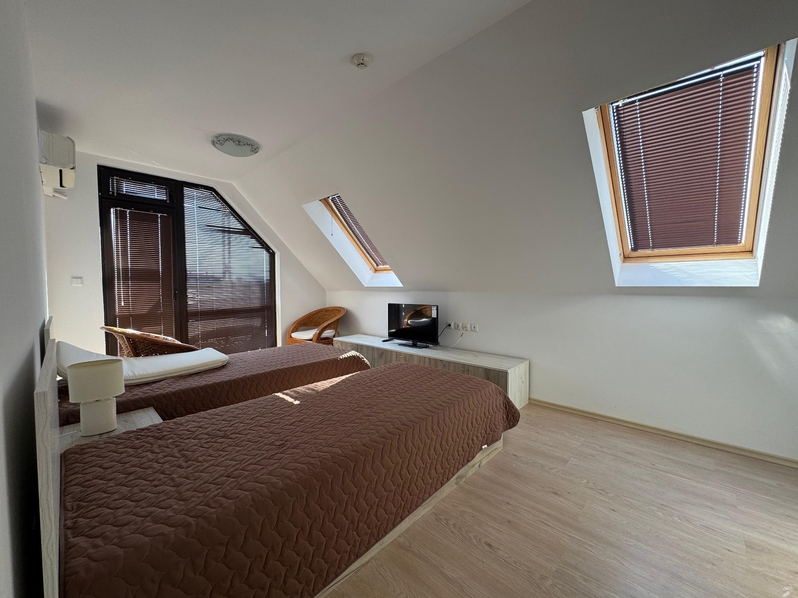Комплекс “Радуга 2” предлагает отличные условия для отдыха и проживания круглый год: открытый бассейн с шезлонгами и зоной отдыха, ухоженные аллеи, кафе, контролируемый доступ и парковка. Годовая плата за обслуживание составляет 650 евро. Рядом находятся магазины, рестораны и автобусная остановка с удобным транспортом до Солнечного берега и Несебра.